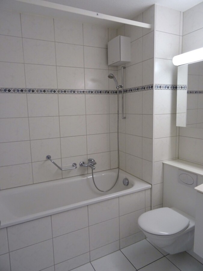 Das Badezimmer ist mit einem WC, Badewanne, großzügigem Spiegelschrank und einem Lavabo mit praktischem Unterbaumöbel eingerichtet. Die Boden- und Wandflächen bestehen aus Platten.