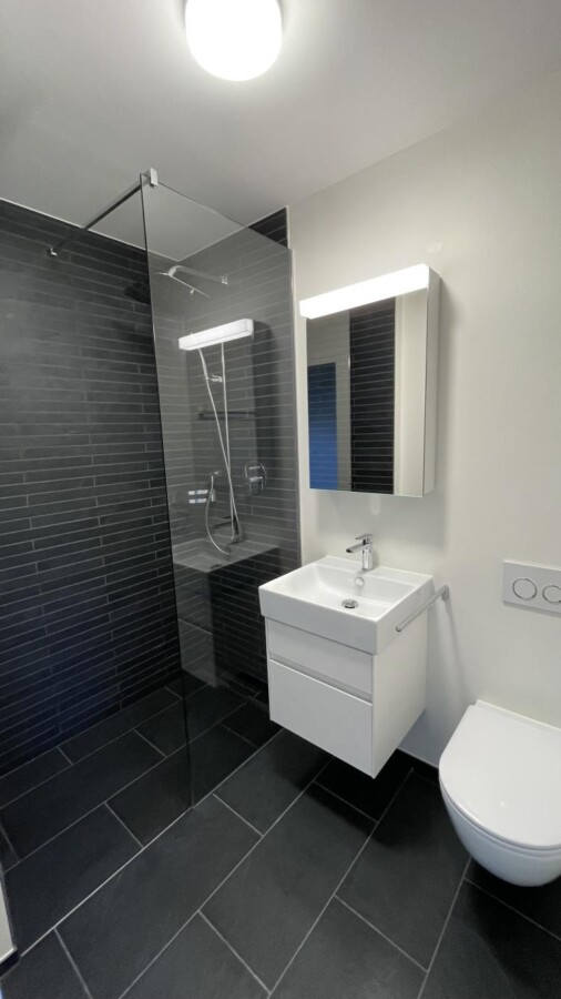 - Nasszelle mit stufenloser begehbarer Dusche (Regendusche + Handbrause), Lavabo mit Unterbaumöbel, Spiegelschrank und WC