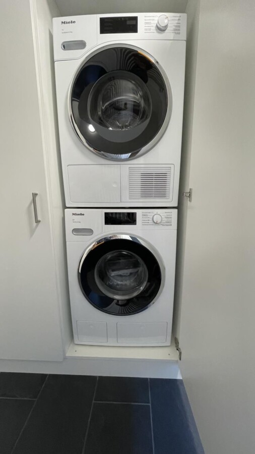 - Eigener Waschturm (Waschmaschine/Tumbler), welcher perfekt im Einbauschrank integriert wurde